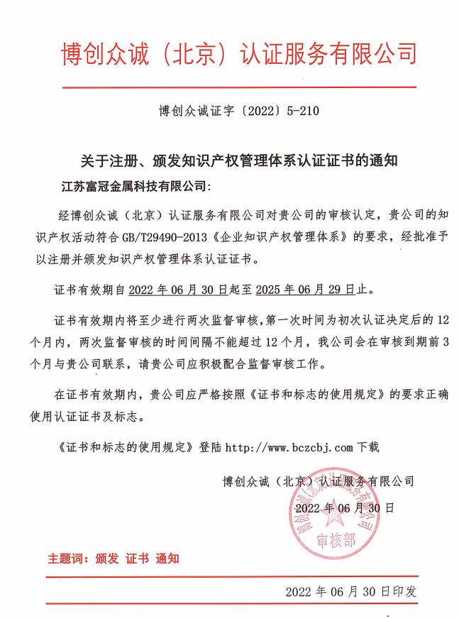 知識(shí)產(chǎn)權(quán)管理體系認(rèn)證證書